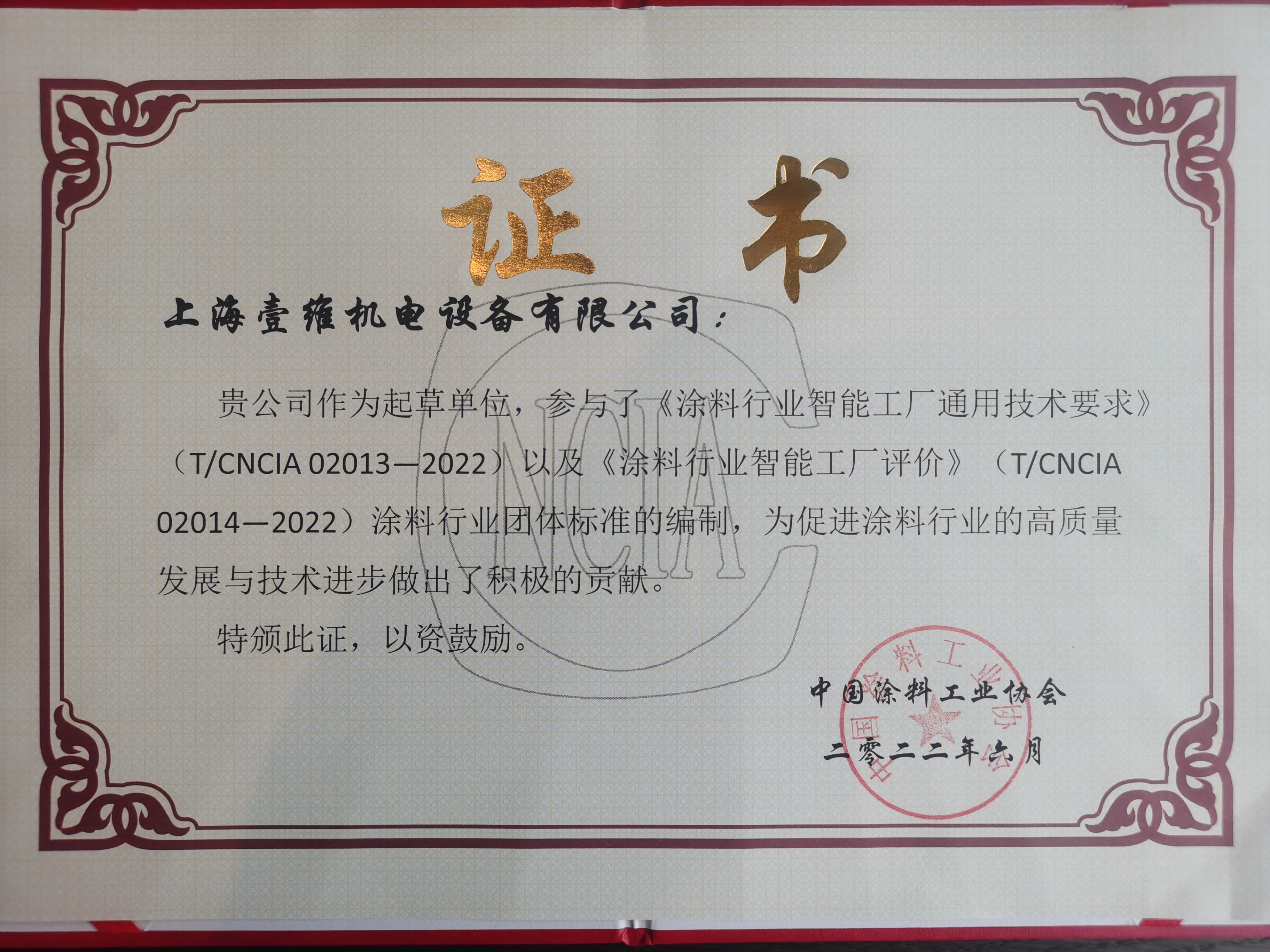 上海壹維作為國內規(guī)模較大的涂料設備制造商之一,是較早引入智能制造,高效環(huán)保技術的涂料生產設備廠家。從涂料廠的規(guī)劃、勘察、設計、采購、施工到投產,具有豐富的行業(yè)經驗。涂料生產過程實現(xiàn)數(shù)字化、智能化、網絡化的運營,從根本上提高產品功能、性能和市場競爭力。同時在此次大會上,上海壹維參與《涂料行業(yè)智能工廠通用技術要求》以及《涂料行業(yè)智能工廠評價》涂料行業(yè)團體標準的編制得到了涂料工業(yè)協(xié)會的認可,并特頒發(fā)證書以資鼓勵。